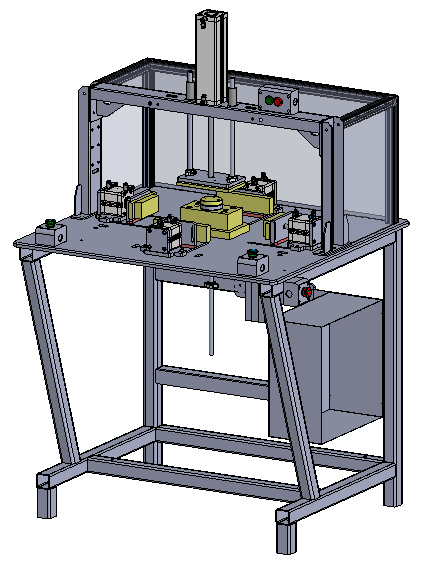 Urządzenie składa się z siłowników, które służą do dociskania (formowania) opakowań. Pole robocze operatora składa się z dwóch przycisków i dwóch lampek sygnalizacyjnych. Za pomocą przycisków operator oburącz obsługuje urządzenie. Zawór bezpieczeństwa sterowany przez Xinje XC-24 zapewnia bezpieczne działanie maszyny.